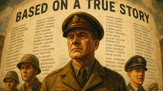 Картинка: (нейросетевой образ с фигурами в военной форме и списком имён) Описание: Трогательная история спасения сотен людей во время Второй мировой войны, основанная на реальных событиях.
